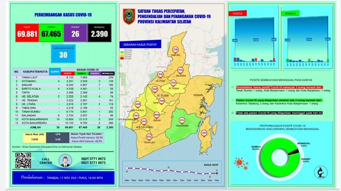 Berdasarkan data Dinkes Kalsel yang diambil dari semua daerah, penambahan kasus positif , Rabu (17/11/2021), sebanyak 3 orang berasal dari Kabupaten Tanah bumbu (Tanbu), Kota Banjarbaru dan Kota Banjarmasin.