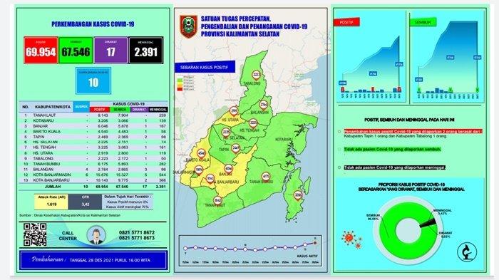 Update covid-19 Kalsel, Selasa (28/12/2021), total positif 69.954 orang, sembuh 67.546 orang, dirawat 17 orang, meninggal 2.391 jiwa, suspek 10 orang.