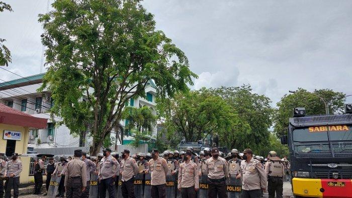 BANJARMASINPOST.CO.ID, BANJARMASIN - Ratusan personel Kepolisian bersiaga dan membentuk barikade di Jalan DI Pandjaitan, Kota Banjarmasin, Provinsi Kalimantan Selatan (Kalsel), Jumat (4/3/2022).