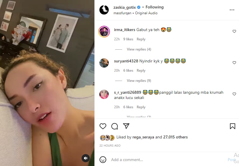 Sambil senderan di sofa, Zaskia Gotik parodikan reels yang lagi hits tersebut.