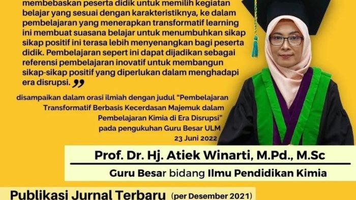 BANJARMASINPOST.CO.ID, BANJARMASIN - Prof Dr Hj Atiek Winarti, M Pd, M Sc, Guru Besar bidang Ilmu Pendidikan Kimia, Universitas Lambung Mangkurat (ULM).