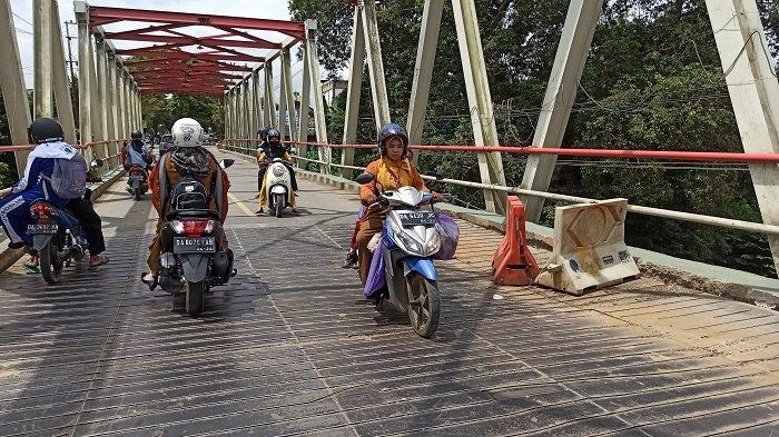 Saat ini, pascadipasangi pelat baja pada lantai jembatan yang rusak, terjadi penurunan pada lantainya.
