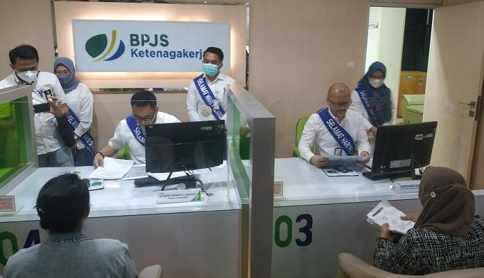 Anggota Dewan Pengawas BPJAMSOSTEK, Yayat Syariful Hidayat, dan Kepala Kantor Cabang BPJAMSOSTEK Banjarmasin, Bunyamin Najmi, serta Deputi Direktur Wilayah BPJAMSOSTEK, Rini Suryani, bersama turun menjadi Customer Service di kantor cabang pelayanan BPJAMSOSTEK Kayutangi Banjarmasin, Senin (5/9/2022).
