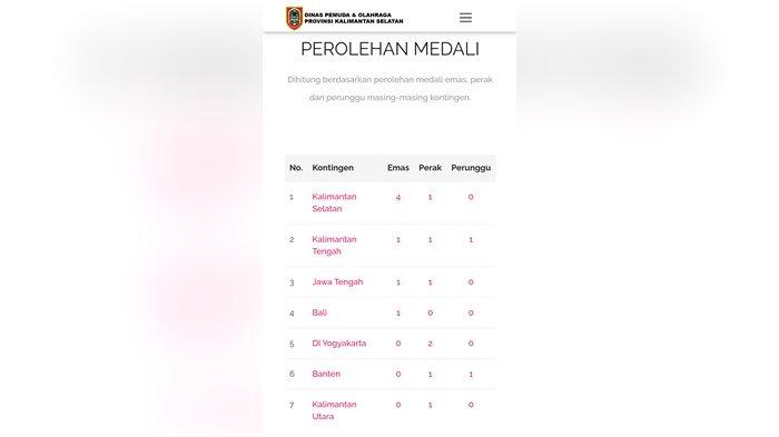 Melihat perolehan medali sementara melalui situs resmi Dispora Kalsel, Senin (31/10/2022) hingga pukul 15.00 wita, saat ini Provinsi Kalsel berada di puncak perolehan medali terbanyak dengan 4 emas dan 1 perak.