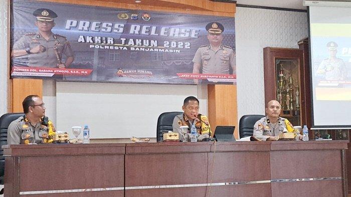 BANJARMASINPOST.CO.ID, BANJARMASIN - Kepala Polresta Banjarmasin, Kombes Sabana Atmojo, menggelar press rilis akhir tahun 2022 di kantornya, Kamis (29/12/2022).