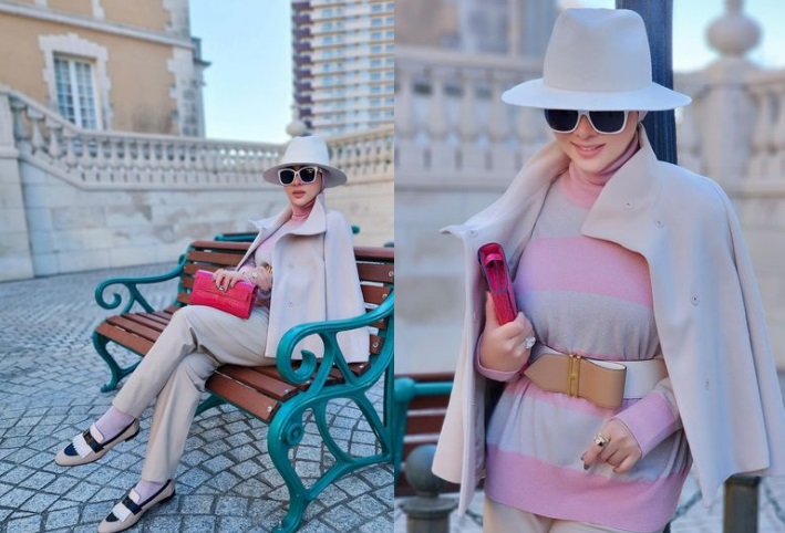 Walau sudah menutup seluruh tubuhnya, Incess masih saja tampak glamor dengan beragam aksesoris yang menghiasi jilbabnya salah satunya adalah topi.