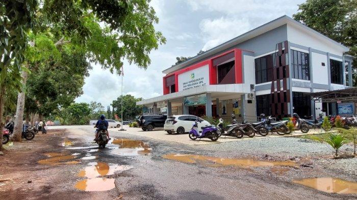 BANJARMASINPOST.CO.ID, PELAIHARI - Megahnya kantor baru Dinas Kependudukan dan Catatan Sipil (Dukcapil) Kabupaten Tanahlaut (Tala), Kalimantan Selatan (Kalsel), kontras dengan jalan yang ada di depan kantor setempat.