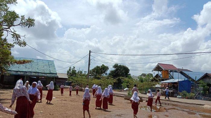 Halaman Sekolah Sering Tergenang, Sebagian Pelajar di Batibati Tala Ini Pakai Alas Kaki Seadanya