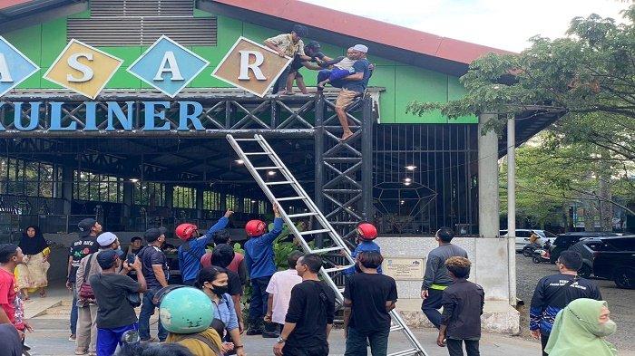 Pedagang di Pasar Kuliner dihebohkan dengan aksi seorang pria yang naik ke atap pasar setempat