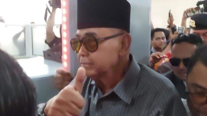 Panji saat itu datang dengan mengenakan kemeja lengan panjang berwarna abu-abu gelap serta peci hitam.
