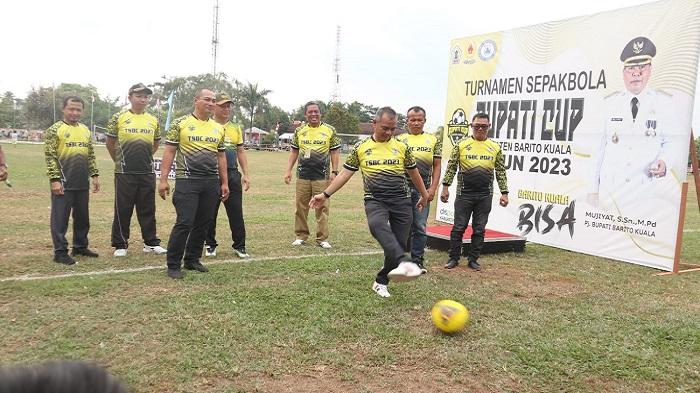 Sekda Batola Ir H Zulkipli Yadi Noor mewakili Pj Bupati Mujiyat membuka Turnamen Sepakbola Bupati Cup ke-IX di lapangan 5 Desember