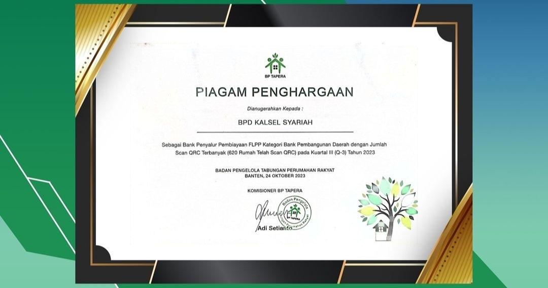 Penghargaan yang diterima Bank Kalsel yakni sebagai Bank Penyalur Peringkat ke-III dengan Capaian Komitmen Diatas 100 persen hingga kuartal III (Q-3) Tahun 2023.