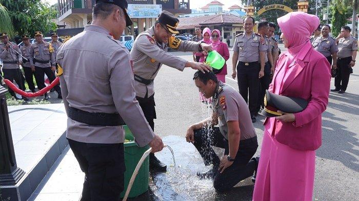 39 personel Polres Hulu Sungai Utara (HSU) menerima kenaikan pangkat. Menandai itu, mereka menjalani prosesi siraman air kembang
