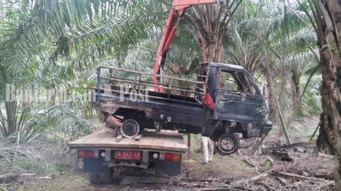 Pikap warna hitam itu ditengarai armada yang dibawa pencuri buah sawit. Pelaku melarikan diri ketika aksinya kepergok pemilik kebun.
