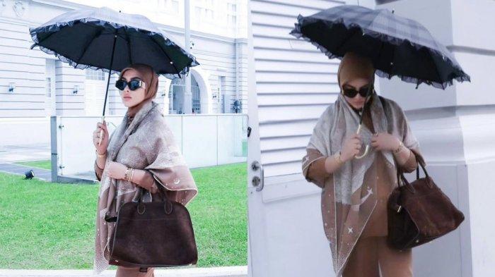 Dalam foto tersebut, Incess tengah menunduk sambil mengenakan payung dan menggendong tas.