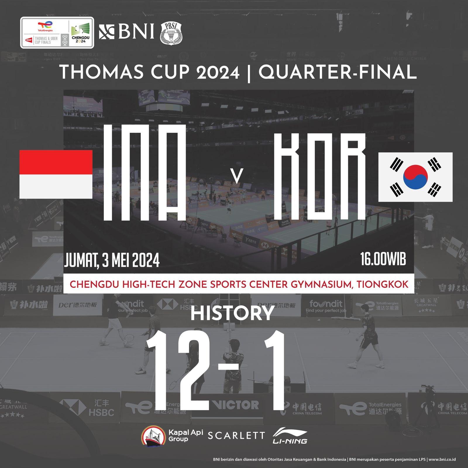 Jadwal Piala Thomas 2024 babak Perempatfinal Indonesia vs Korea Selatan di ajang Piala Thomas dan Uber 2024 melalui Live Streaming TV Online INews TV dan Vision + mulai pukul 16.00 WIB.