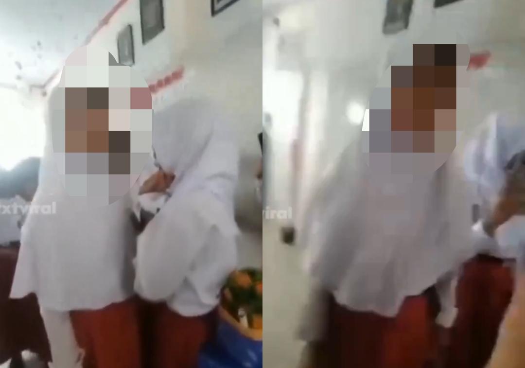 Siswi yang masih duduk di kelas 5 tampak ketakutan saat jilbab yang dikenakannya ditarik oleh sang kakak kelas.