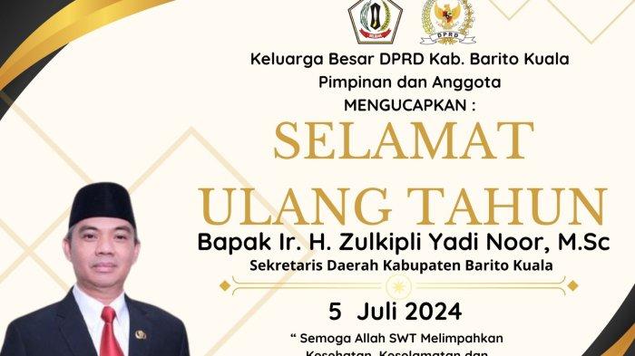 BANJARMASINPOST.CO.ID, MARABAHAN - Keluarga besar DPRD Kabupaten Barito Kuala, pimpinan dan anggota mengucapkan selamat ulang tahun, Sekretaris Daerah Kabupaten Barito Kuala Ir H Zulkipli Yadi Noor, M.Sc, pada 5 Juli 2024.