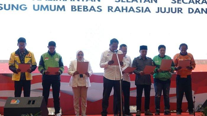 Acara puncak deklarasi ditandai dengan pembacaan ikrar pilkada damai yang dilakukan oleh perwakilan dari Aliansi Serikat Buruh dan Komunitas Ojek Online Kalsel.