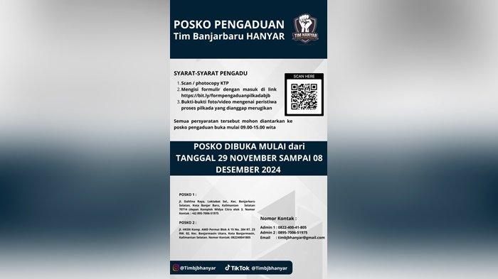 Posko pengaduan juga dibuka bagi masyarakat yang merasa dirugikan. Posko beroperasi dari 29 November hingga 8 Desember 2024, pukul 09.00–15.00 Wita, di dua lokasi: Banjarmasin dan Banjarbaru.
