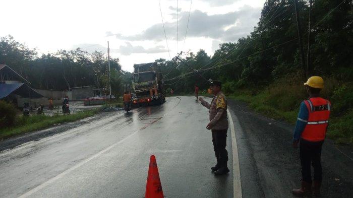 Satu tiang listrik di Jalan A Yani Kecamatan Sungai Loban miring diduga karena hujan lebat, arus pengendara terganggu hingga dilakukan ini