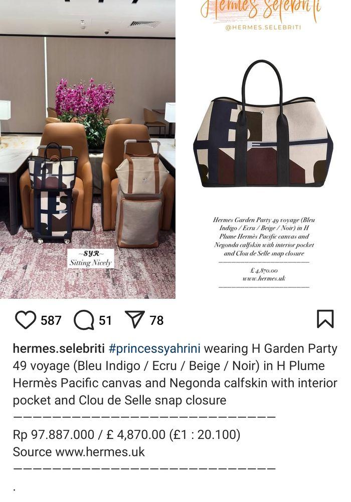 "#princessyahrini wearing H Garden Party 49 voyage (Bleu Indigo / Ecru / Beige / Noir) in H Plume Hermès Pacific canvas and Negonda calfskin with interior pocket and Clou de Selle snap closure."