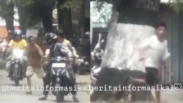 Diduga terlibat konflik, kedua pria yang belum diketahui identitasnya tersebut saling kejar di tengah jalan hingga turut meresahkan pengendara dan warga yang melintas.