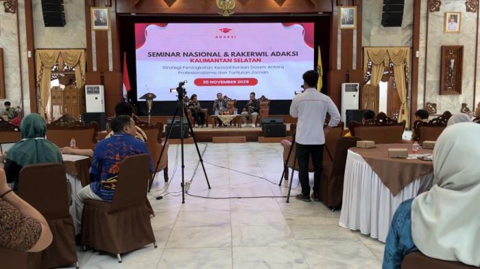 BANJARMASINPOST.CO.ID,BANJARMASIN - Persoalan kesejahteraan dosen kembali menjadi sorotan dalam Seminar Nasional bertema “Strategi Peningkatan Kesejahteraan Dosen: Antara Profesionalisme dan Tuntutan Zaman” yang digelar bersamaan dengan Rapat Kerja Wilayah Aliansi Dosen Akademik dan Kevokasian Seluruh Indonesia (ADAKSI) di Gedung Mahligai Pancasila, Provinsi Kalimantan Selatan, Kamis pagi (20/11/2025) pukul 09.00 Wita.