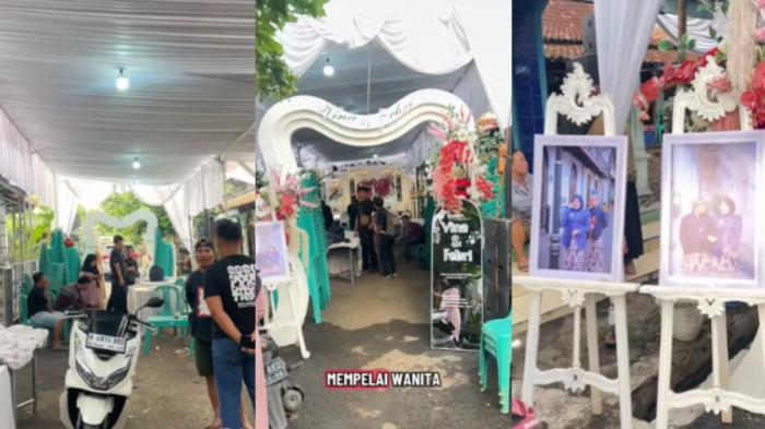 Lewat pajangan yang dipasang di depan tenda pernikahan, terkuak kalau mempelai wanita bernama Vina.