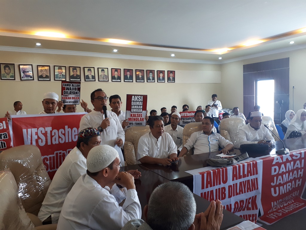 Puluhan perwakilan agen perjalanan penyelenggara umrah di Kalimantan Selatan (Kalsel) berkumpul di Kantor Kemenag Provinsi Kalsel