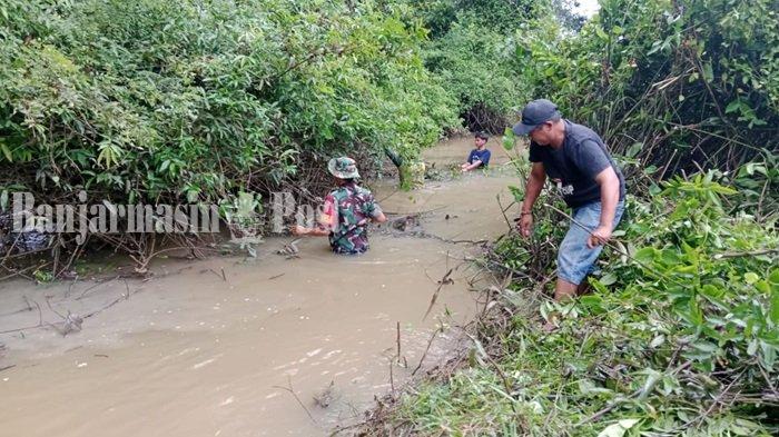 Koramil 06/Barabai bersama warga masyarakat Desa Mandingin dan Kias melaksanakan karya bakti membersihkan aliran sungai setempat, Selasa, (12/03/2024)Selasa, 12 Maret 2024