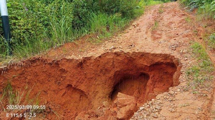 Hujan deras membuat akses jalan utama di Dusun Mindai Desa Muara Hungi menuju Desa Datar Batung, HST ambles hingga nyaris terputus