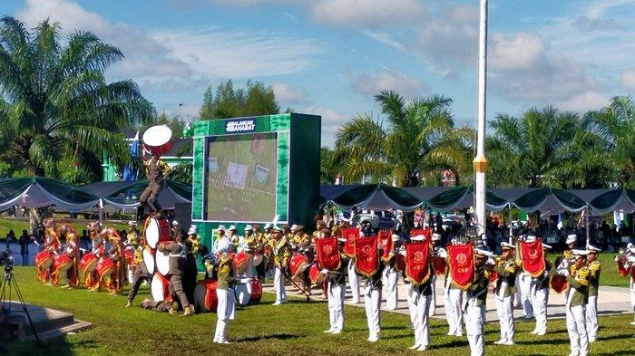 Aksi drum band Gita Muda Praja dari Dinas Satpol PP Balangan mengawali acara puncak Hari Jadi Balangan ke-22 dipuji Gubernur Kalsel, Muhidin