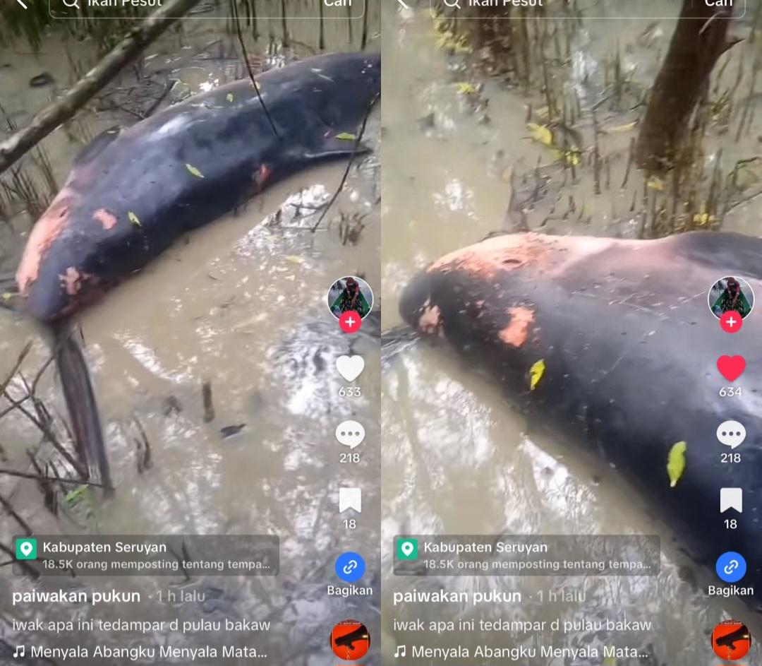 Viral di TikTok penampakan bangkai diduga ikan pesut yang terdampar di kawasan hutan bakau, Seruyan, Kalimantan Tengah.