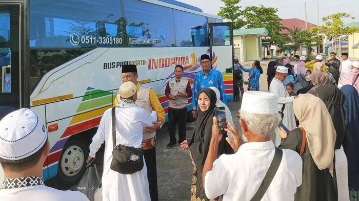 Sebanyak 10 bus yang mengangkut 317 orang haji dari Kabupaten Kapuas tiba di halaman Masjid Al-Mukarram Amanah Kota Kuala Kapuas, Kamis (13/7/2023).