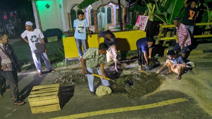 Lubang besar di atas jembatan Walangku, dekat Pasar Walangku, jalur Kabupaten HST dan Kabupaten HSU ditutup warga dengan menggunakan cor semen.