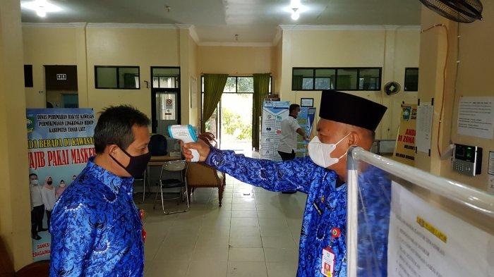 Sekda Tanahlaut H Dahnial Kiflie spontan mengambil alih tugas pengecek suhu tubuh di Dinas LH saat menyaksikan tak ada petugas yang melakukannya