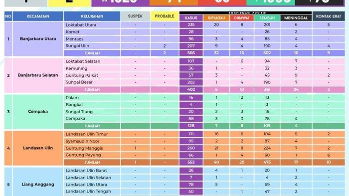 Data kasus Covid-19 Dinas Kesehatan Kota Banjararu, total positif 1.826 orang, sembuh 1.603 orang, meninggal 73 orang.