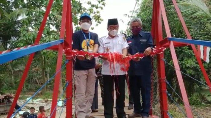 Peresmian ditandai pemotongan pita tanda mulai digunakannya jembatan gantung di Desa Baru HST untuk masyakat umum