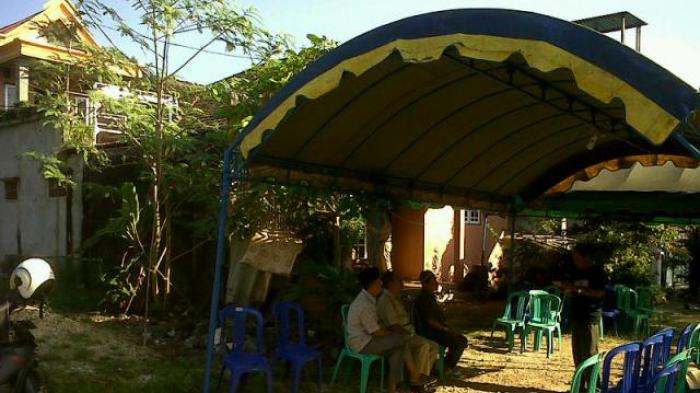 Deret tenda duka tampak terpasang di halaman rumah sederhana nomor 14 RT10 RW3 Jalan Sapta Marga Blok C Kelurahan Guntung Payung Landxasan Ulin, Rabu