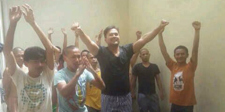 Saipul yang mengenakan kaus hitam dan celana pendek bergaris-garis terlihat tersenyum sampil mengangkat kedua tangannya.