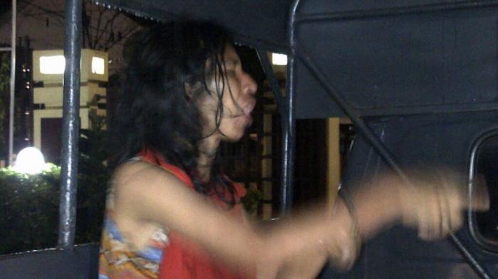 Petugas Polda Kalimantan Selatan yang sedang berjaga langsung mengamankan wanita yang didga pelempar kaca penjagaan Polda Kalsel di Jalan S Parman,