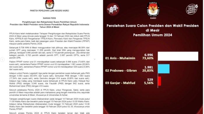 Berdasarkan data PPLN Kairo, paslon nomor urut 01, Anies Baswedan-Muhaimin Iskandar unggul jauh yakni 73,60 persen dibandingkan dua pasangan lainnya.