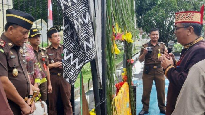 Upacara Adat Penyambutan Kepala Kejaksaan Tinggi Kalimantan Tengah Mukri, diawali dengan potong pantan saat memasuki pintu gerbang Kejaksaan Tinggi