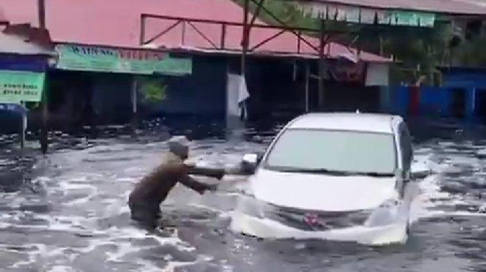 Sempat terbawa arus air, sebuah mobil nekat melewati titik banjir di Tumbang Nusa Kalimantan Tengah