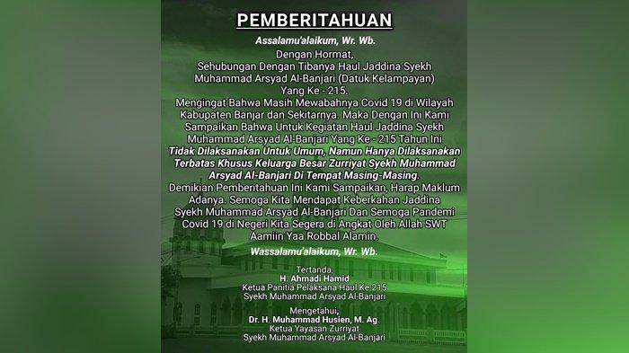 Pandemi Covid-19 membuat panitia haul ke-215 Datu Kelampayan atau Syech Muhammad Arsyad Al Banjari di Kabupaten Banjar hanya dihadiri orang terbatas.
